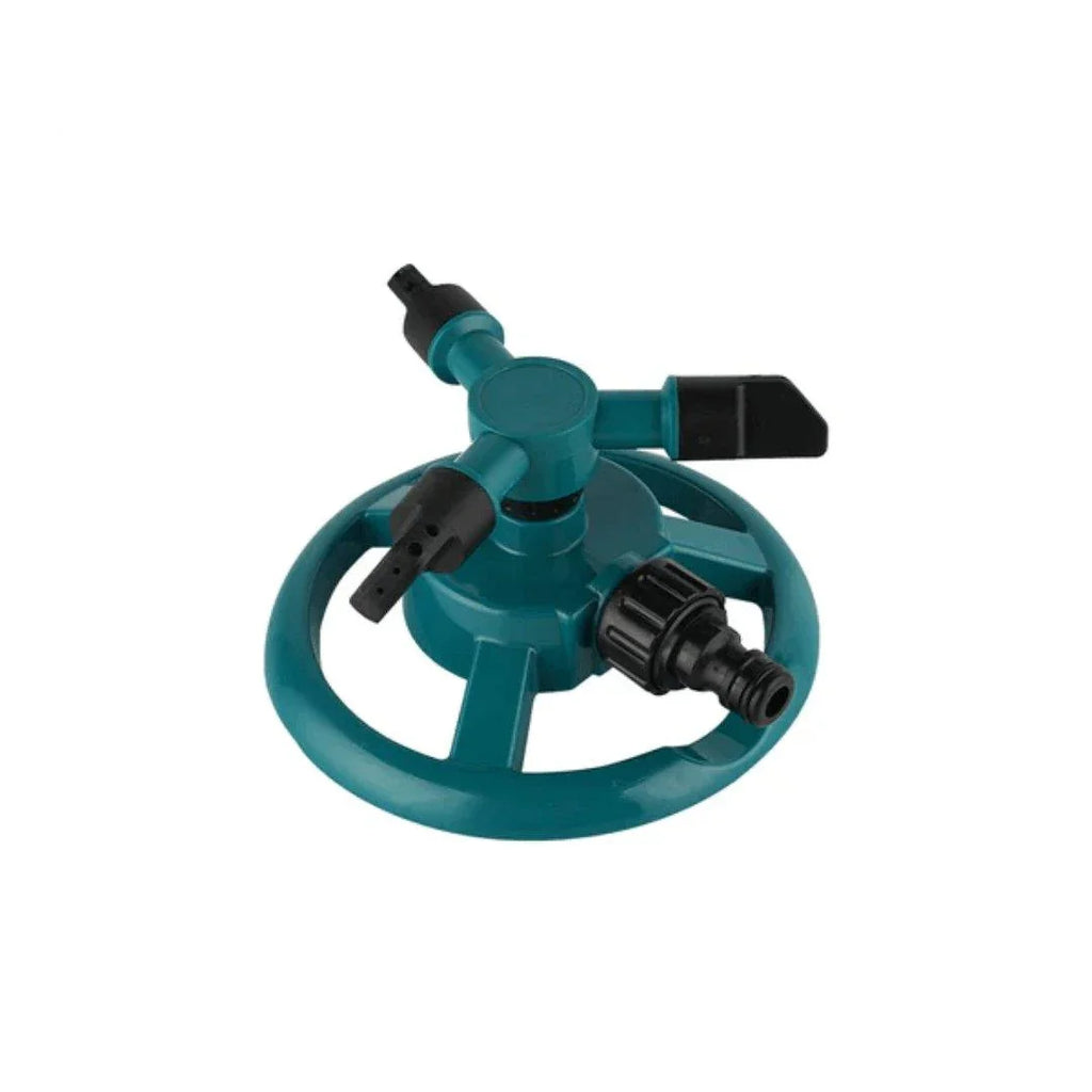 Modelo: Aspersor Irrigador de Jardim Automático Material: Plástico ABS Cor: Verde e Azul Tamanho: 15 cm x 8,5 cm Detalhes: Com recurso de 360° graus de rotação automático e três bicos para saída de água.
