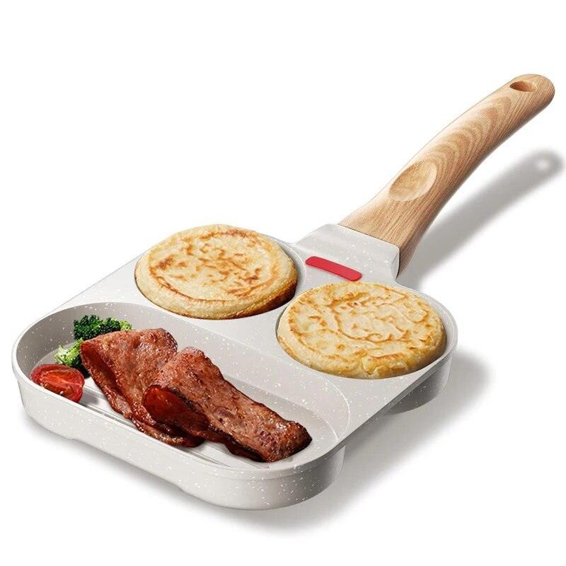 Esta frigideira possui 4 ou 3 compartimentos para ovos, hambúrgueres e muito mais garantindo cozimento prático e rápido.