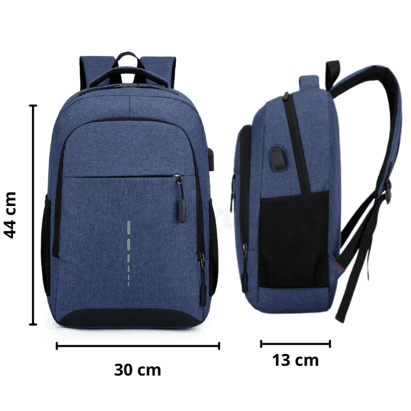 A lateral da mochila conta com USB para carregamento de dispositivos móveis